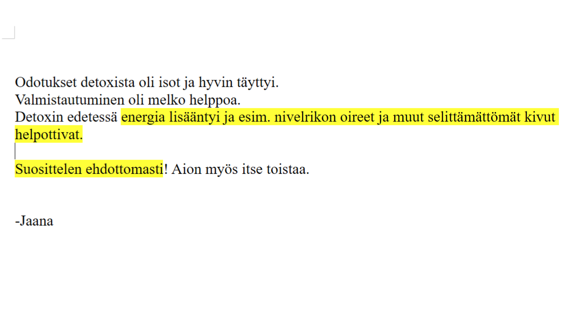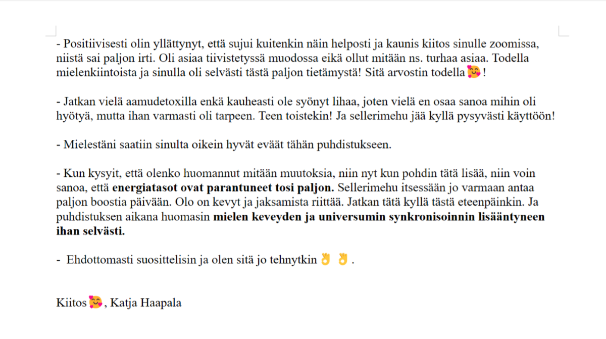 ”Detoxin edetessä energia lisääntyi ja esim. nivelrikon oireet ja muut selittämättömät kivut helpottivat.”