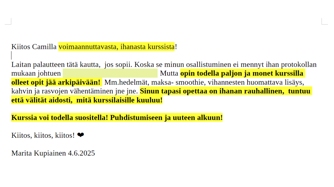 ”Kurssia voi todella suositella! Puhdistumiseen ja uuteen alkuun!”